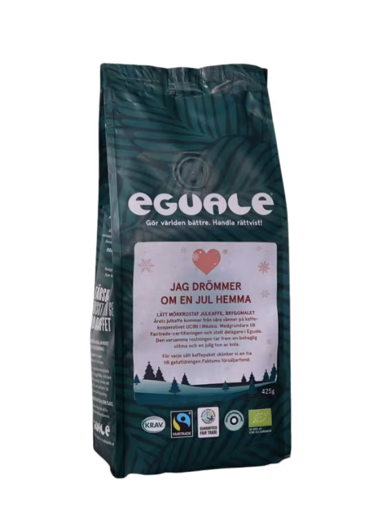 Upptäck Eguale Julkaffe, 100% Arabica, mörkrostat från Mexiko & Peru. Mjuk sötma med kolatoner. Perfekt för julmys och hemtrevlig julstämning! 🎄