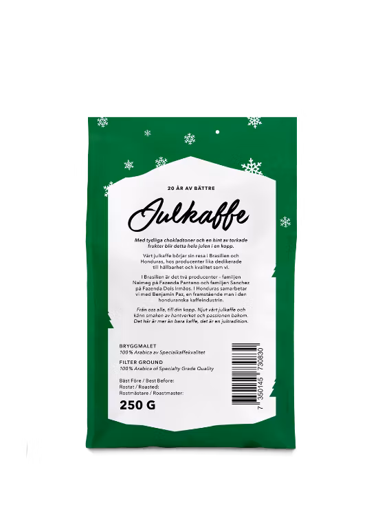 Det här kaffet är en julig blandning från Brasilien och Honduras, där passionerade kaffebönder lägger ner sin själ i både kvalitet och hållbarhet. Från Brasilien har Johan & Nyström hämtat kaffebönor från familjerna Naimeg och Sanchez, som odlar sitt kaffe med kärlek och en lång tradition av hållbarhet och regenerativt jordbruk. Och i Honduras samarbetar de med Benjamin Paz, en riktig kaffeprofil som jobbar tätt med småskaliga odlare i det unika mikroklimatet i Santa Barbara-regionen. Resultatet? Ett julkaffe som är perfekt att förgylla mörka vinterdagar med!